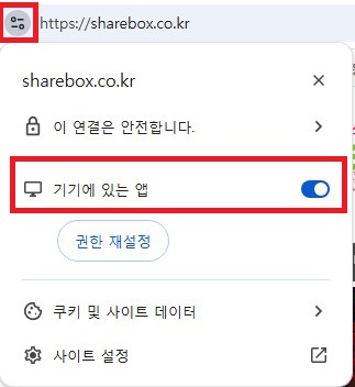 이는 [기기에 있는 앱], [디바이스의 앱] 권한이 차단이 되어서 발생하는 문제로 브라우저 주소줄 왼쪽 사이트 권한 메뉴를 누른다음 사이트 설정에서 [기기에 있는 앱], [디바이스의 앱] 을 허용해주시면 정상적으로 이용이 가능 합니다.